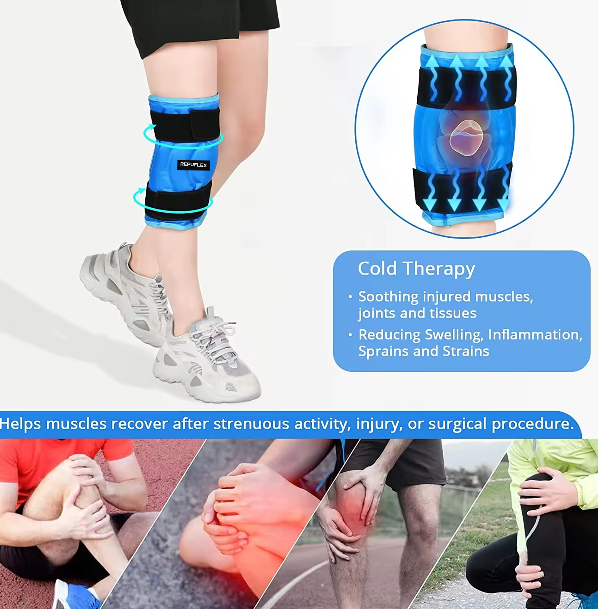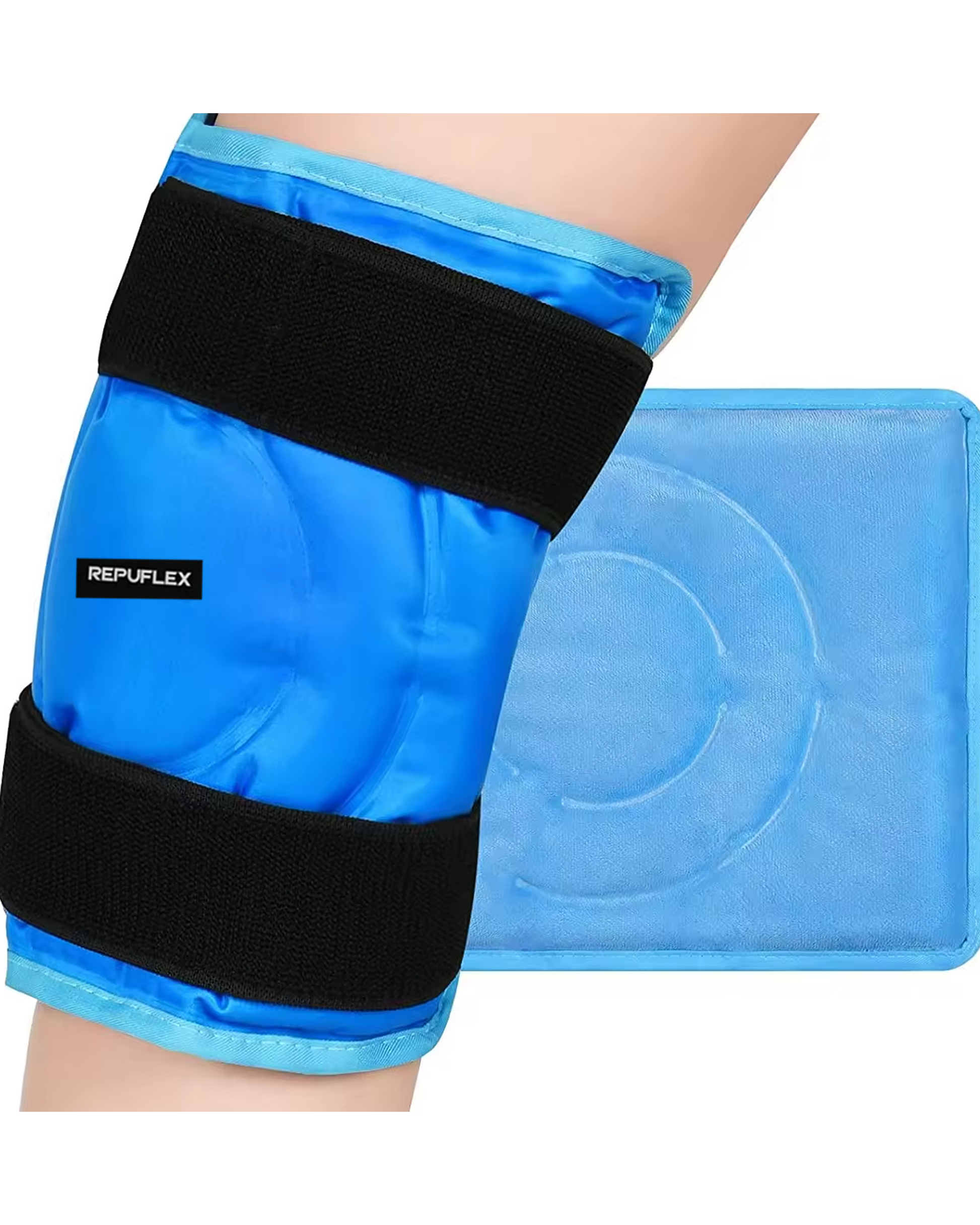 Perfect for soothing strains, sprains, and soreness in the knees and legs, the Repuflex™ knee ice wrap provides cooling relief with mild compression to relieve pain, swelling, and inflammation in the knee. The contoured ice pack is ideal for those recovering from knee replacement surgery, repair, patella realignment, injury, and arthritis pain relief.